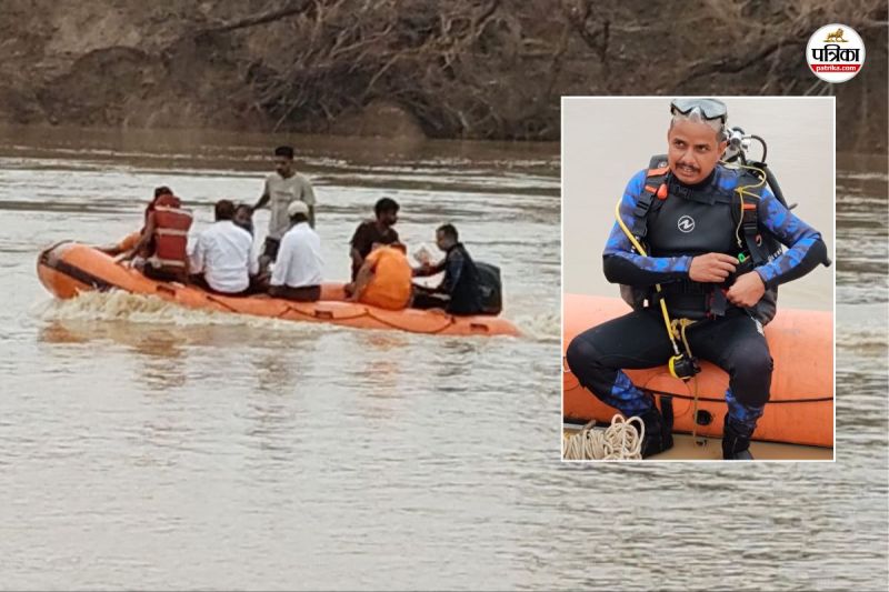 बूंदी के बड़ाखेडा के जाडला गांव के पास मेज नदी मे भारत पेट्रोलियम काॅरपोरेशन की पाइप लाइन लीकेज हो गई, जिसकी तलाश करते सिविल डिफेंस की टीम। फोटो पत्रिका