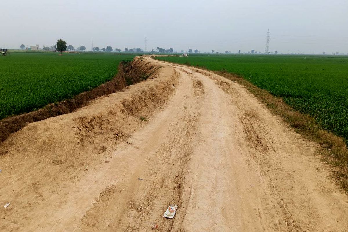 रामगंजबालाजी लालपुरा गांव के निकट किसानों द्वारा सड़क का निर्माण कार्य बंद करवाने के बाद अधूरा पड़ा सड़क निर्माण कार्य।