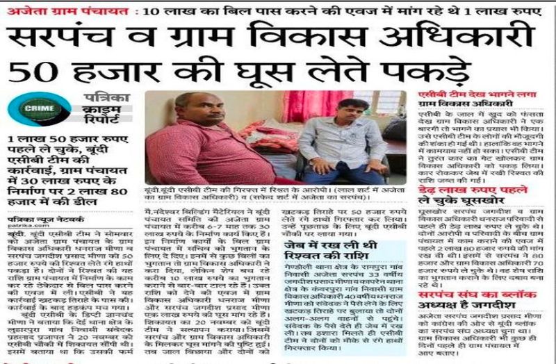 बूंदी एसीबी टीम ने 22 नवम्बर 2021 को अजेता ग्राम पंचायत के ग्राम विकास अधिकारी धनराज मीणा व सरपंच जगदीश प्रसाद मीणा को 50 हजार रुपये की रिश्वत लेते रंगे हाथों पकड़ा था। दोनों ने रिश्वत की यह राशि ग्राम पंचायत में निर्माण के काम कर रहे ठेकेदार से बिल पास करने की एवज में ली। एसीबी ने यह कार्रवाई खटकड़ तिराहे के पास की थी। इसके बाद ग्राम विकास अधिकारी को निलंबित कर दिया गया था। दोनों डेढ़ लाख रुपये पहले ले चुके थे।