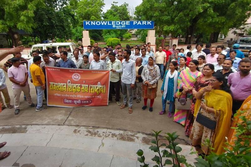 बूंदी. राजस्थान शिक्षक संघ राष्ट्रीय ने गुरुवार को प्रदर्शन कर जिला कलक्टर को ज्ञापन देकर शिक्षकों को ई ग्राम प्रभारी के रूप में नियुक्त किए जाने पर विरोध जताया। संगठन के जिलाध्यक्ष प्रदीप यादव के नेतृत्व में दिए गए ज्ञापन के अनुसार बूंदी ब्लॉक के शिक्षकों की नियुक्ति ई ग्राम प्रभारी के रूप में की गई है। जबकि वर्तमान में विद्यालय में नवीन सत्र का आरंभ हुआ है तथा विद्यालयों में प्रवेश उत्सव निशुल्क पाठ्य पुस्तक वितरण शाला दर्पण ऑनलाइन कार्य हरयाळो राजस्थान आदि कार्य संचालित हो रहे हैं ऐसे में शिक्षक शिक्षण कार्य कैसे कर पाएगा।