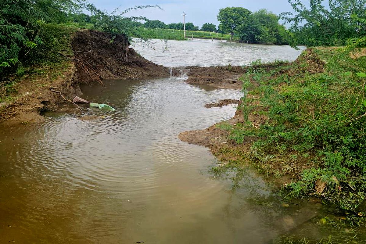 देई. क्षेत्र में हुई अतिवृष्ट से टूटे तलाई की कच्ची दीवार।