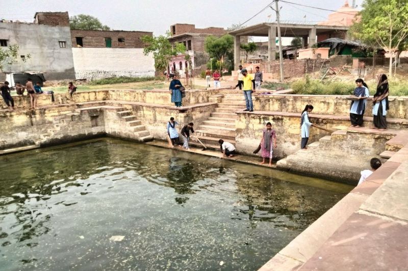 कापरेन. अमृतमं जलम् अभियान में प्राचीन महादेव कुंड पर सफाई कार्य करती छात्राएं।