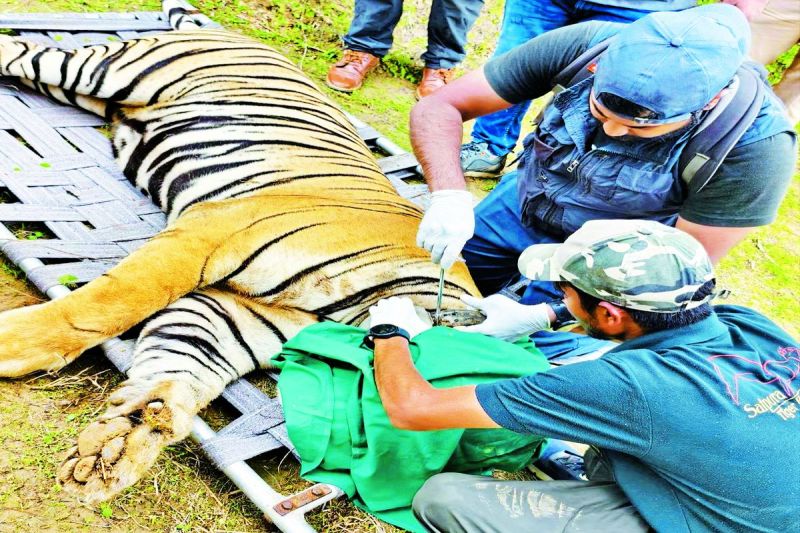 गुढ़ानाथावतान. रामगढ़ विषधारी टाइगर रिजर्व में बाघ को ट्रेंकुलाइज कर सेटेलाइट कॉलर को सही करते पशु चिकित्सक।