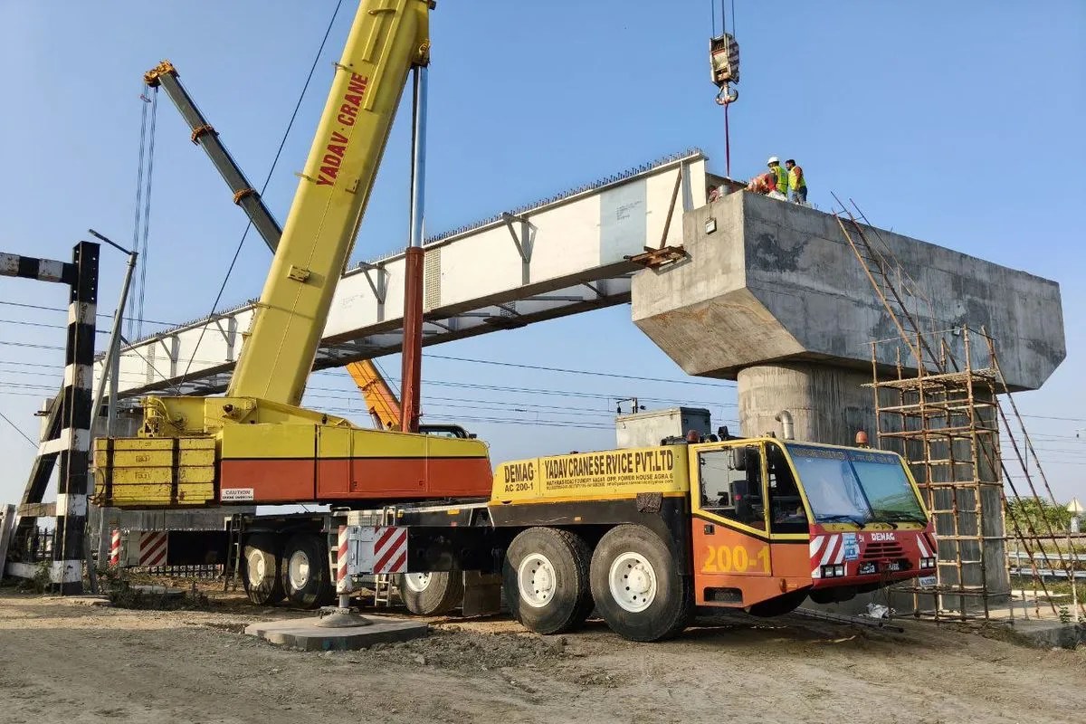 लबान. देईखेड़ा में रेल लाइन के ऊपर स्लेब रखती क्रेन।