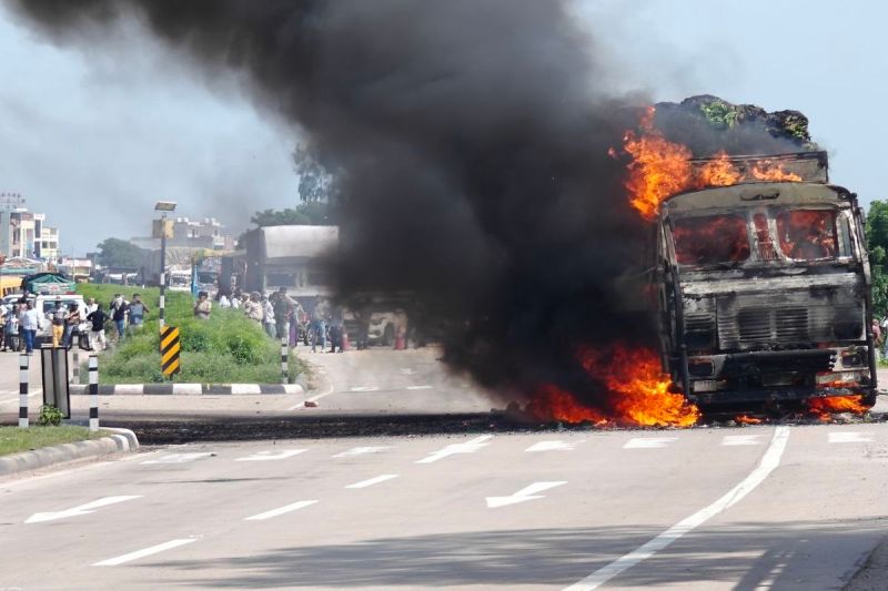 रामगंजबालाजी बायपास पर हुई दुर्घटना के बाद ट्रक में लगी आग।