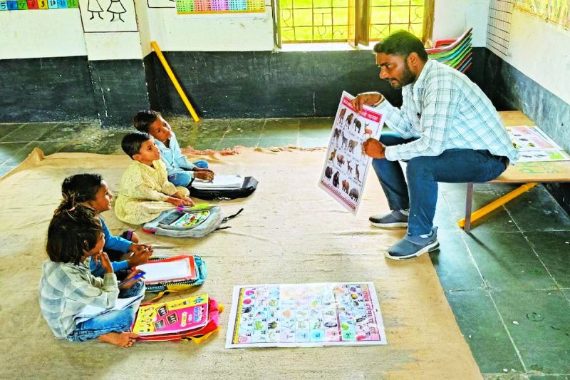 नैनवां. उपखण्ड के देवधुआ गांव के प्राथमिक विद्यालय में चार बच्चों को पढ़ाते शिक्षक।