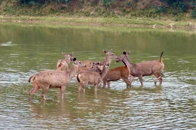 गुढ़ानाथावतान. रामगढ़ महलों के पास मेज नदी में जलक्रीड़ा करती मादा सांभर व बच्चों का समूह।