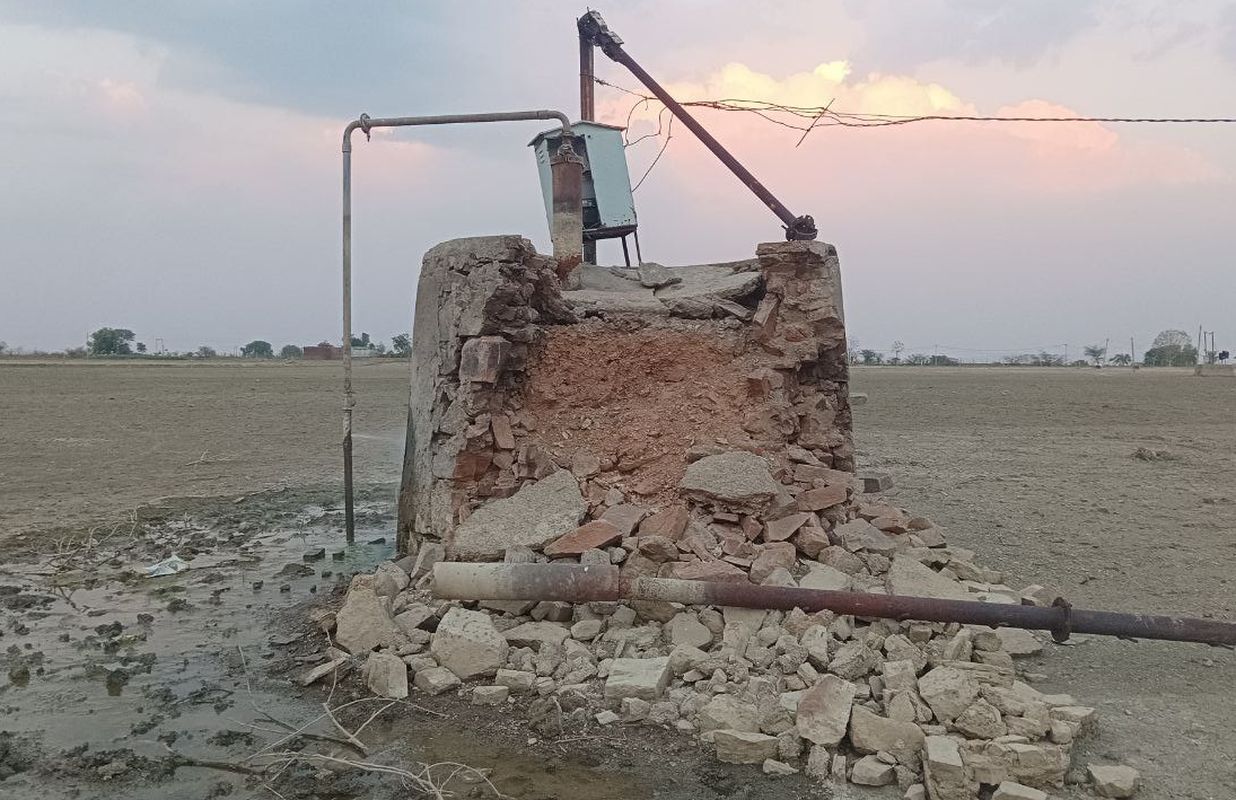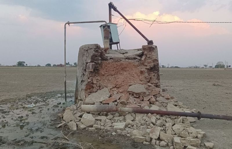 देई. पाईबालापुरा बांध पेयजल स्कीम पर क्षतिग्रस्त नलकूप का चबूतरा।