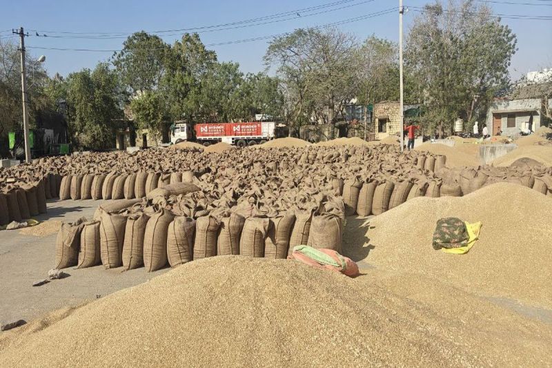 देई.कृषि उपज मंडी देई मे गेहूं खरीद केन्द्र पर लगे गेहूं के ढेर व कट्टे।