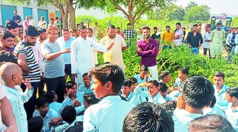 करवर. आंतरदा स्थित विद्यालय के सामने सडक़ पर अवरोधक लगाकर जाम लगाने के दौरान समझाईश करते हुए।