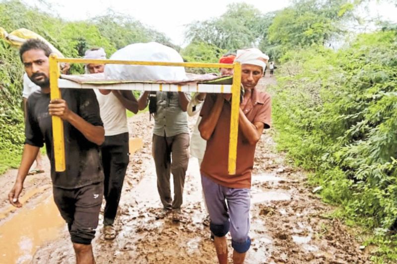 गांव का रास्ता खराब होने से दो किलोमीटर तक शव को चारपाई से घर ले जाते ग्रामीण (फोटो: पत्रिका)