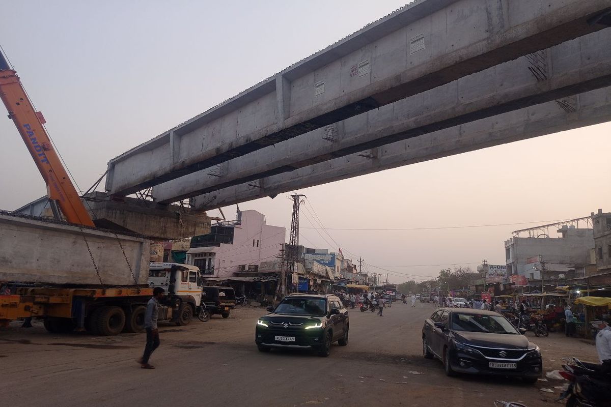 केशवरायपाटन. सहकारी चीनी मिल चौराहे पर क्रेनो से ओवरब्रिज पर स्लीपर डालते हुए।