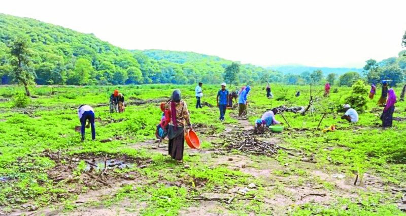 गुढ़ानाथावतान क्षेत्र के गुढ़ा-नीम का खेड़ा वन खण्ड में कालदां माता जंगल की पहाड़ी के ऊपर ग्रास का मैदान तैयार करने के लिए पौधे लगाते श्रमिक।