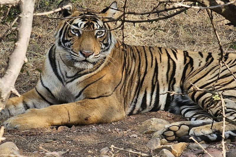 बूंदी. रामगढ़ विषधारी टाइगर रिजर्व क्षेत्र के क्लोजर में बैठा बाघ।
