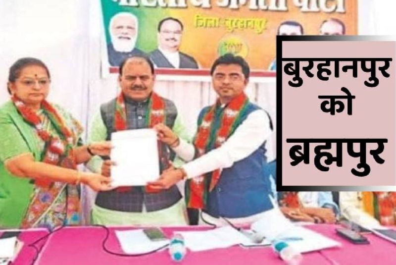 बुरहानपुर. भारतीय जनता पार्टी ने बुरहानपुर का नाम बदलकर प्राचीन ब्रह्मपुर किए जाने की मांग उठाई है। इसे लेकर बुरहानपुर आए भाजपा के प्रदेश महामंत्री भगवानदास सबनानी को भाजपा जिलाध्यक्ष मनोज लधवे ने एक पत्र सौंपा। साथ ही कहा मप्र सरकार को बुरहानपुर के इतिहास से अवगत कराकर शहर का नाम परिवर्तित कर ब्रह्मपुर कराया जाए। पौराणिक इतिहास में बुरहानपुर का नाम ब्रह्मपुर ही था जो बाद में बदल दिया गया था।