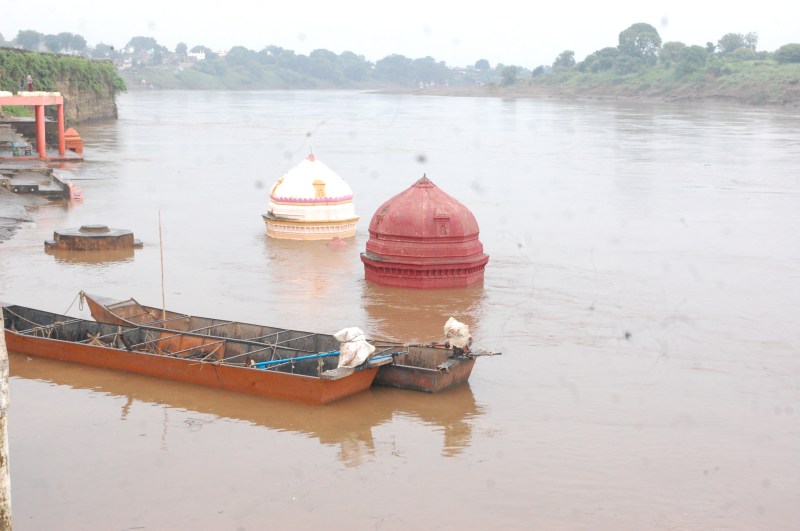 बुरहानपुर. बैतूल चांदोरा डेम के चार गेट खोलने के बाद बुरहानपुर ताप्ती नदी में बाढ़ आ गई। रविवार को ताप्ती नदी खतरे के निशान से तीन मीटर ऊपर बह निकली। राजघाट लालदेव मंदिर आधा डूबने के बाद जिला प्रशासन अलर्ट हो गया। निचली बस्तियों में रहने वालों को जागरूक करने के लिए सोशल मीडिया पर मैसेज वायरल किया गया। शाम 4 बजे तक ताप्ती नदी का जल स्तर 221.380 मीटर तक पहुंचा। शाम तक ताप्ती नदी खतरे के निशान से ऊपर बह रही थी।