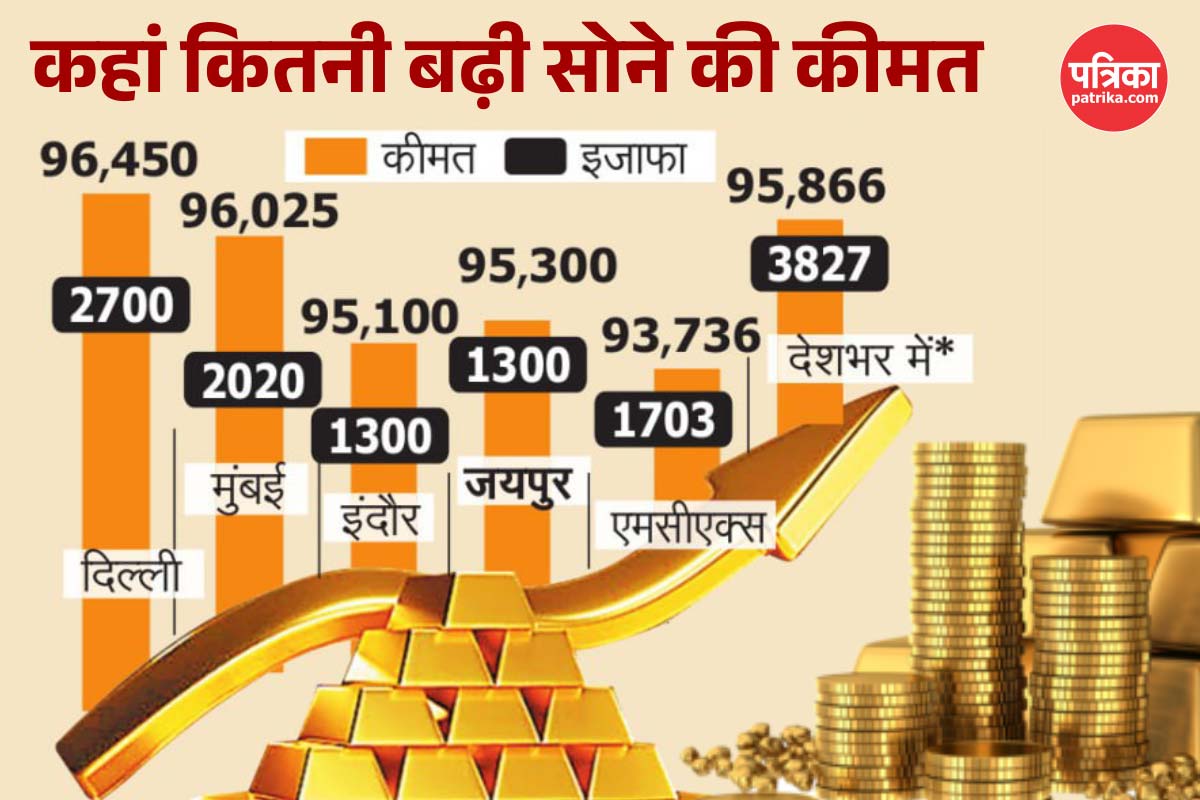 Gold Price: अमेरिका और चीन के बीच बढ़ती व्यापार जंग के कारण सोने की कीमतों में भारतीय सर्राफा बाजारों के साथ वायदा बाजार एमसीएक्स, अंतरराष्ट्रीय बाजार और अमेरिका वायदा बाजार कॉमेक्स पर नए ऑल-टाइम हाई पर पहुंच गया। ट्रेड वॉर के कारण महंगाई बढऩे की आशंका, सप्लाई चेन में रुकावट औक डॉलर की कीमतें घटने से सोने को सपोर्ट मिला। शुक्रवार को एमसीएक्स पर वायदा सोना 1703 रुपए चढ़कर 93,736 पर पहुंच गया। वहीं नई दिल्ली में 10 ग्राम 24 कैरेट सोने की कीमत 96,400 रुपए की रिकॉर्ड ऊंचाई पर पहुंच गई। अंतरराष्ट्रीय बाजार में रिकॉर्ड कीमतों के कारण देश में गोल्ड चढ़ा है।