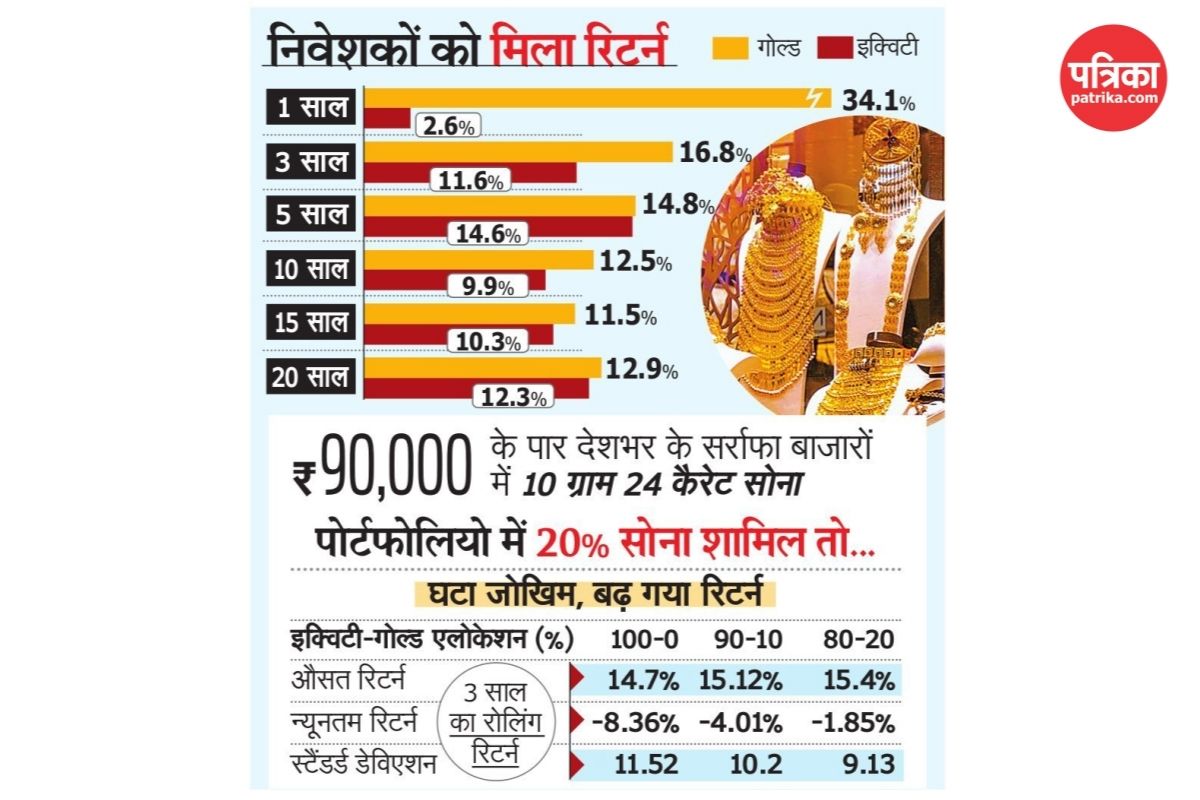 IIM अहमदाबाद के इंडियन गोल्ड पॉलिसी सेंटर की ओर से कराए गए एक सर्वे के मुताबिक, 56% सोना ऐसे लोग खरीदते हैं, जिनकी सालाना आय 2 लाख से 10 लाख रुपए के बीच है। वर्ष 2022 से अब तक सोने की कीमत दोगुनी हो गई है, लेकिन इस आय वर्ग की बचत नहीं बढ़ी है, ऐसे में सोना खरीदने की उनकी क्षमता कम हुई है। कीमतों में तेजी के कारण गोल्ड ने पिछले 20 साल के हर टाइम-फ्रेम में इक्विटी से अधिक रिटर्न दिया है। वहीं पोर्टफोलियो में 20% सोना शामिल करने पर जोखिम (स्टैंडर्ड डेविएशन) घटा है और रिटर्न में इजाफा हुआ है।