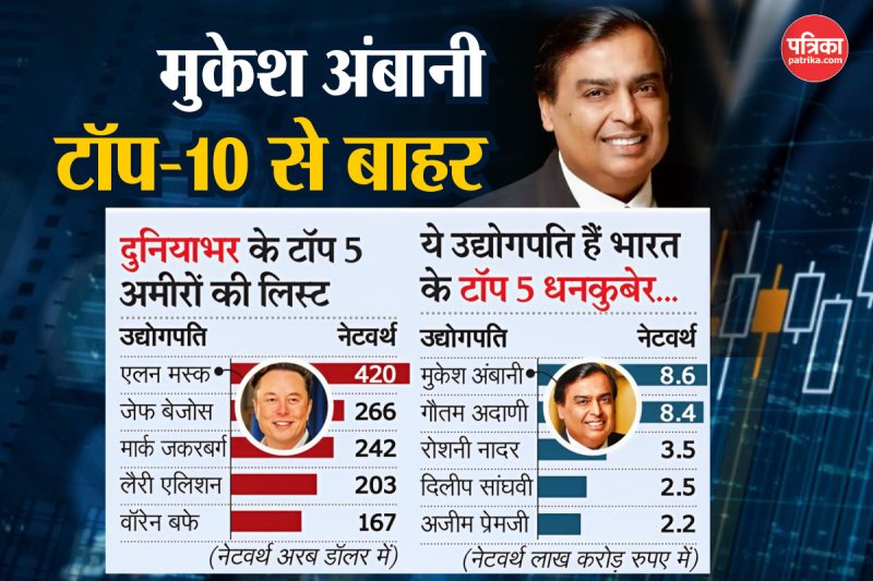 बता दें कि दुनिया के सबसे अमीरों की टॉप-10 की सूची में एक भी भारतीय का नाम नहीं है। इसकी वजह है कि अंबानी की नेटवर्थ में पिछले एक साल में कुल एक लाख करोड़ रुपये की कमी आई है। अब मुकेश अंबानी की नेटवर्थ 8.6 लाख करोड़ रुपये है। अंबानी पूरी दुनिया के अमीरों की लिस्ट में 18वें नंबर पर हैं। हालांकि वे अब भी भारत और एशिया के सबसे अमीर व्यक्ति है। दूसरे नंबर पर गौतम अडानी हैं जिनकी दौलत इस साल एक लाख करोड़ बढ़ी है।