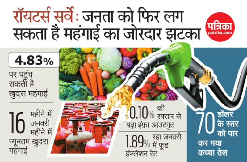सर्वे में कहा गया है कि पेट्रोलियम के अलावा फूड इंफ्लेशन में तेजी का भी असर दिख रहा है। इस समय पेट्रोल-डीजल का रेट आसमान छू रहा है। देश के कई शहरों में पेट्रोल 100 रुपए प्रति लीटर बिक रहा है, जबकि कच्चा तेल एक साल में पहली बार 70 डॉलर के स्तर को पार कर गया है। आरबीआइ के गवर्नर शक्तिकांत दास ने भी कहा था कि अगर पेट्रोल और डीजल की कीमत पर कंट्रोल नहीं किया जाता है, तो ट्रांसपोर्टेशन कॉस्ट बढ़ जाएगी और खुदरा महंगाई में तेजी आएगी।
