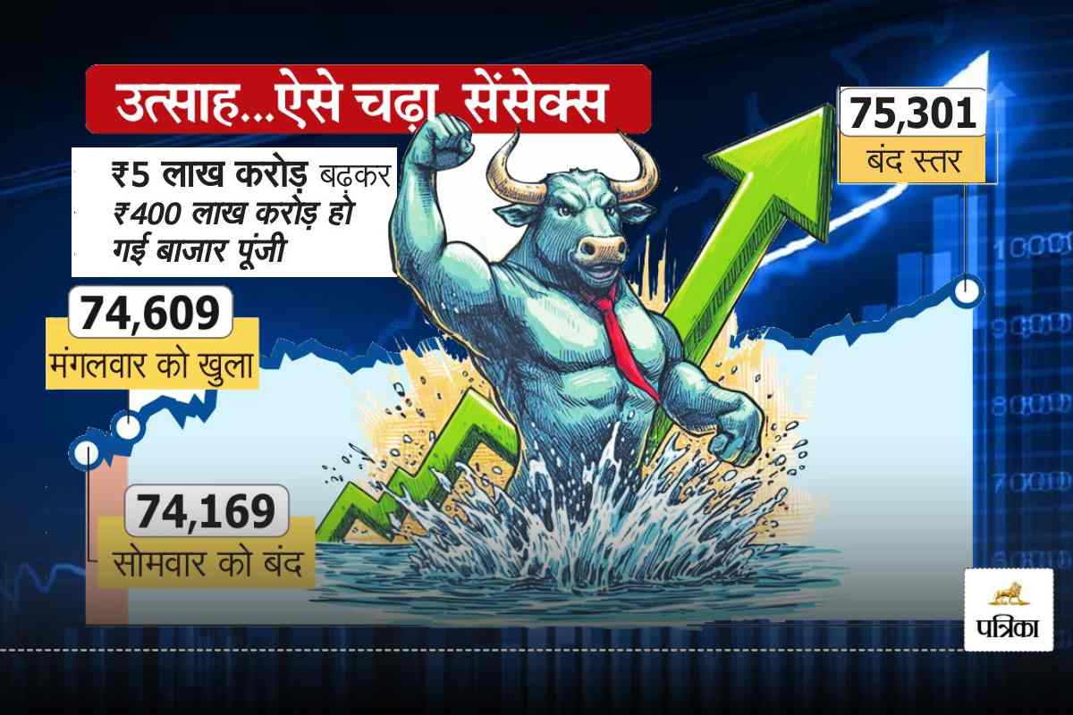 अमेरीका सहित वैश्विक शेयर बाजारों में तेजी, डॉलर के गिरने से रुपए में आई तेजी और भारतीय बाजार का वैल्यूएशन आकर्षक होने से निचले स्तर पर हुई जबरदस्त खरीदारी से भारतीय शेयर बाजार में मंगलवार को 2 महीने की सबसें बड़ी इंट्राडे तेजी आई। सेंसेक्स फिर 75,000 के पार निकल गया। कारोबार के दौरान यह 75,386 अंक तक गया और अंत में 1131 अंक यानी 1.52त्न उछलकर 75,30 पर बंद हुआ। इसी तरह निफ्टी भी 325 अंक यानी 1.44त्न की शानदार तेजी के साथ 22,834 पर बंद हुआ। मिडकैप और स्मॉलकैप इंडेक्स में 2 से अधिक तेजी आई, जिससे भारतीय कंपनियों की बाजार पूंजी 5 लाख करोड़ रुपए बढक़र फिर से 400 लाख करोड़ रुपए हो गई।