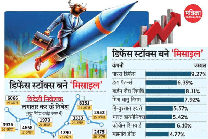 भारत-पाकिस्तान के बीच तनाव बढ़ने से एयरोस्पेस के साथ डिफेंस स्टॉक्स में तेजी आई। डिफेंस स्टॉक 10 प्रतिशत तक चढ़ गए। वहीं केंद्रीय कैबिनेट की ओर से 25,000 करोड़ के मैरीटाइम डेवलपमेंट फंड को मंजूरी मिलने की उम्मीद से शिपिंग कंपनियों के शेयर भी रॉकेट बन गए।