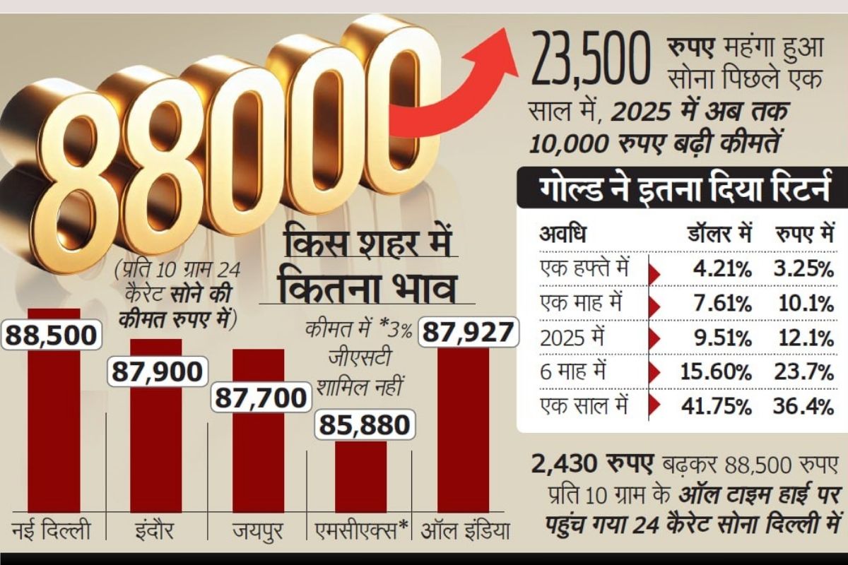 एमसीएक्स पर सोमवार को 10 ग्राम 24 कैरेट वायदा सोना 85,900 रुपए के नए ऑल-टाइम हाई पर पहुंच गया। आइबीजेए के मुताबिक, देशभर के सर्राफा बाजारों में 10 ग्राम 24 कैरेट सोने की औसत कीमत करीब 1,000 रुपए चढक़र 87,900 रुपए पर पहुंच गया। इस भाव में 3त्न जीएसटी शामिल है। सोने की कीमत में पिछले एक साल से लगातार तेजी आ रही है। इस साल अब तक इसमें 10% से ज्यादा की तेजी आ चुकी है। वहीं भारत में पिछले एक साल में सोना 23,500 रुपए से अधिक महंगा हुआ है। फरवरी 2024 में 10 ग्राम सोने की कीमत 64,200 रुपए के करीब थी।