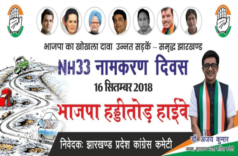 (रांची): झारखंड प्रदेश कांग्रेस कमेटी के अध्यक्ष डॉ. अजय कुमार के नेतृत्व में रविवार को रांची-टाटा राष्ट्रीय राजमार्ग संख्या-33 की जर्जर स्थिति को लेकर प्रदर्शन किया गया। कांग्रेस कार्यकर्त्ताओं ने जमशेदपुर के पारडीह चौक के निकट राष्ट्रीय उच्च पथ के नामकरण को लेकर आदिवासी रीति-रिवाज के साथ पूजा-अर्चना के बाद “ भाजपा हड्डी तोड़ हाईवे-33 “ का बोर्ड लगाया। कांग्रेस ने एनडीए सरकार के चार वर्ष के कार्यकाल के दौरान इस सड़क निर्माण का कार्य पूरा नहीं होने के कारण यह नामकरण किया। इसके तहत रांची से बहरागोड़ा तक छह स्थानों पर नामकरण का बोर्ड लगाया गया है।