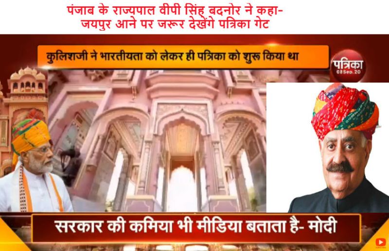 चंडीगढ़। पंजाब के राज्यपाल और केन्द्र शासित प्रदेश चंडीगढ़ के प्रशासक वीपी सिंह बदनोर ने राजस्थान पत्रिका समूह के प्रधान संपादक डॉ. गुलाब कोठारी को धन्यवाद दिया है कि उन्होंने गुलाब नगरी जयपुर पत्रिका गेट के माध्यम से अनुपम भेंट दी है। राजस्थान के सभी इलाकों के वास्तुशिल्प और सांस्कृतिक विरासत को प्रदर्शित करने वाले पत्रिका गेट को प्रधानमंत्री नरेंद्र मोदी ने वर्चुअल समारोह में देशवासियों को समर्पित किया। पीएम मोदी ने इस मौके पर 'राजस्थान पत्रिका' समूह के प्रधान संपादक गुलाब कोठारी द्वारा रचित दो ग्रंथ 'संवाद उपनिषद्' और 'अक्षर यात्रा' का भी विमोचन किया। कार्यक्रम में विशिष्ट अतिथि के रुप में सीएम अशोक गहलोत और राज्यपाल कलराज मिश्र शामिल हुए। श्री बदनोर ने लोकार्पण कार्यक्रम यूट्यूब पर लाइव देखा।