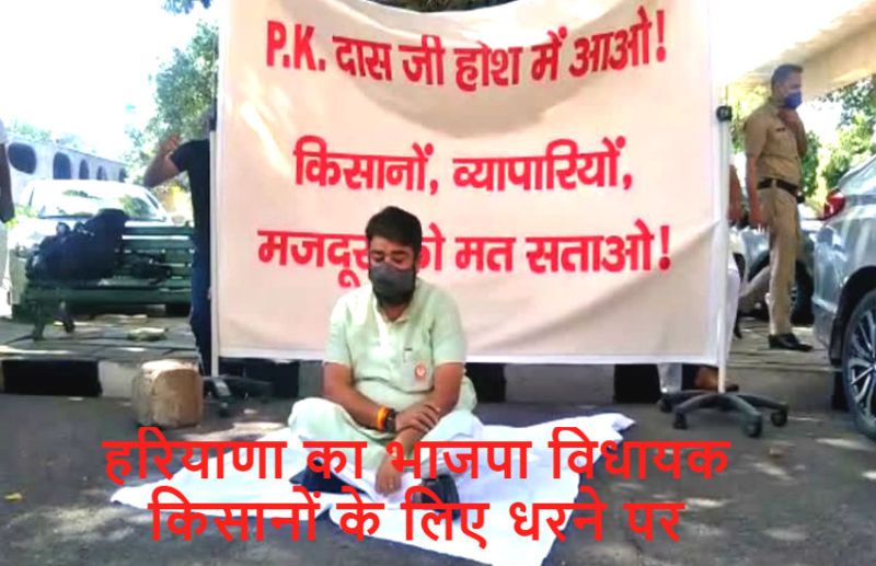चंडीगढ़ में हरियाणा विधान भवन परिसर के बाहर धरने पर बैठे भाजपा विधायक असीम गोयल