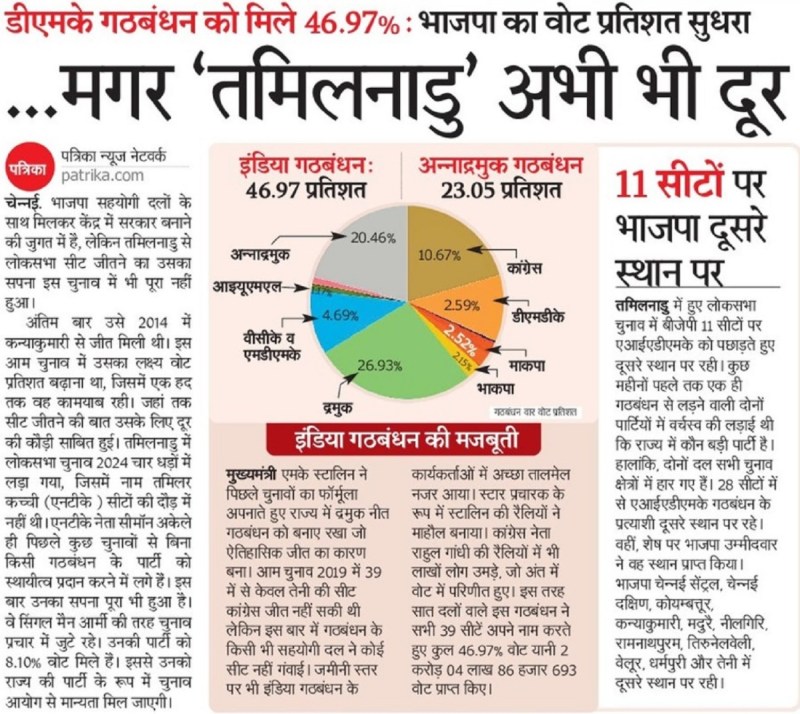 भाजपा का वोट प्रतिशत सुधरा…मगर ‘तमिलनाडु’ अभी भी दूर<b>चेन्नई. </b>भाजपा सहयोगी दलों के साथ मिलकर केंद्र में सरकार बनाने की जुगत में है, लेकिन तमिलनाडु से लोकसभा सीट जीतने का उसका सपना इस चुनाव में भी पूरा नहीं हुआ।अंतिम बार उसे 2014 में कन्याकुमारी से जीत मिली थी। इस आम चुनाव में उसका लक्ष्य वोट प्रतिशत बढ़ाना था, जिसमें एक हद तक वह कामयाब रही। जहां तक सीट जीतने की बात उसके लिए दूर की कौड़ी साबित हुई। तमिलनाडु में लोकसभा चुनाव 2024 चार धड़ों में लड़ा गया, जिसमें नाम तमिलर कच्ची (एनटीके ) सीटों की दौड़ में नहीं थी। एनटीके नेता सीमॉन अकेले ही पिछले कुछ चुनावों से बिना किसी गठबंधन के पार्टी को स्थायीत्व प्रदान करने में लगे हैं। इस बार उनका सपना पूरा भी हुआ है। वे सिंगल मैन आर्मी की तरह चुनाव प्रचार में जुटे रहे। उनकी पार्टी को 8.10% वोट मिले हैं। इससे उनको राज्य की पार्टी के रूप में चुनाव आयोग से मान्यता मिल जाएगी।<b>इंडिया गठबंधन की मजबूती</b><b>CM </b>एमके स्टालिन ने पिछले चुनावों का फॉर्मूला अपनाते हुए राज्य में द्रमुक नीत गठबंधन को बनाए रखा जो ऐतिहासिक जीत का कारण बना। आम चुनाव 2019 में 39 में से केवल तेनी की सीट कांग्रेस जीत नहीं सकी थी लेकिन इस बार में गठबंधन के किसी भी सहयोगी दल ने कोई सीट नहीं गंवाई। जमीनी स्तर पर भी इंडिया गठबंधन के कार्यकर्ताओं में अच्छा तालमेल नजर आया। स्टार प्रचारक के रूप में स्टालिन की रैलियों ने माहौल बनाया। कांग्रेस नेता राहुल गांधी की रैलियों में भी लाखों लोग उमड़े, जो अंत में वोट में परिणीत हुए। इस तरह सात दलों वाले इस गठबंधन ने सभी 39 सीटें अपने नाम करते हुए कुल 46.97% वोट यानी 2 करोड़ 04 लाख 86 हजार 693 वोट प्राप्त किए।<b>11 सीटों </b><b>पर भाजपा दूसरे स्थान पर</b><b></b><b>तमिलनाडु </b>में हुए लोकसभा चुनाव में बीजेपी 11 सीटों पर एआईएडीएमके को पछाड़ते हुए दूसरे स्थान पर रही। कुछ महीनों पहले तक एक ही गठबंधन से लड़ने वाली दोनों पार्टियों में वर्चस्व की लड़ाई थी कि राज्य में कौन बड़ी पार्टी है। हालांकि, दोनों दल सभी चुनाव क्षेत्रों में हार गए हैं। 28 सीटों में से एआईएडीएमके गठबंधन के प्रत्याशी दूसरे स्थान पर रहे। वहीं, शेष पर भाजपा उमीदवार ने वह स्थान प्राप्त किया। भाजपा चेन्नई सेंट्रल, चेन्नई दक्षिण, कोयबत्तूर, कन्याकुमारी, मदुरै, नीलगिरि, रामनाथपुरम, तिरुनेलवेली, वेलूर, धर्मपुरी और तेनी में दूसरे स्थान पर रही।