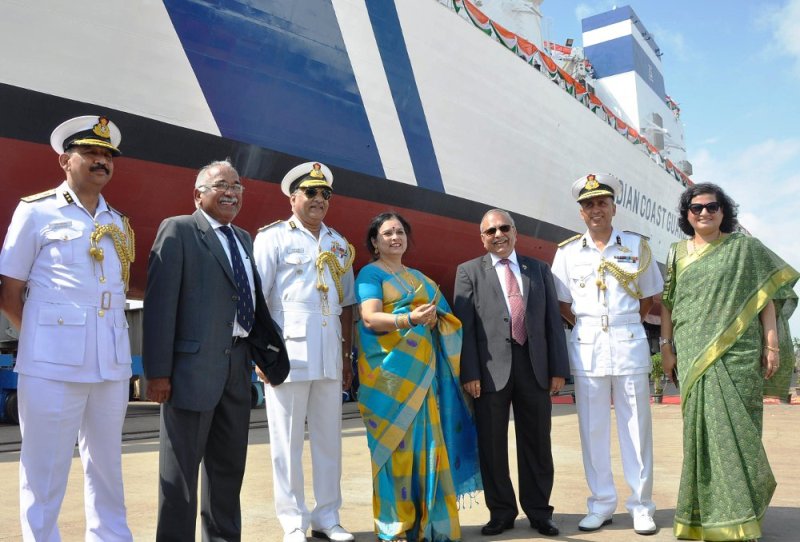 चेन्नई के पास कट्टुपाली में शुक्रवार को एलएंडटी शिपयार्ड पर तटरक्षक बल के ऑफशोर पेट्रोल जहाज विक्रम की सेवाएं आरंभ करने के मौके पर आईसीजी के अतिरिक्त महानिदेशक वीएसआर मूर्ति, उनकी पत्नी ज्योती मूर्ति, इंस्पेक्टर जनरल रंजन बरगोत्रा, वाइस एडमिरल बी. कण्णन व अन्य।