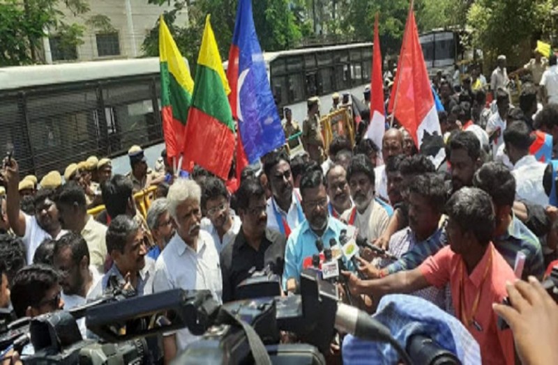 चेन्नई. श्रीलंकाई तमिलों के खिलाफ हुए अत्याचार और युद्ध अपराध पर भारत सरकार द्वारा संयुक्तराष्ट्र की बैठक में दबाव बनाने को लेकर गुरुवार को नुंगम्बाक्कम स्थित श्रीलंकाई दूतावास के समक्ष गुरुवार को काफी संख्या में लोगों ने जुटकर विरोध प्रदर्शन किया। इस प्रदर्शन का नेतृत्व वीसीके नेता तोल तिरुमावलवन और डीवीके नेता कोलातूर मणी ने किया। करीब ३०० से अधिक संख्या में लोगों ने श्रीलंकाई दूतावास के आगे नारेबाजी और विरोध प्रदर्शन किया। मामले पर विशेष जानकारी देते हुए वीसीके युवा इकाई की सहायक सचिव जयंती अलफोंजे ने कहा कि संयुक्त राष्ट्र संघ का सत्र चल रहा है। वर्ष २०१५ में एक प्रस्ताव पास कर श्रीलंका को लिट्टे के खात्मे के दौरान श्रीलंकाई तमिलों पर हुए अत्याचार, युद्ध अपराध की समीक्षा कर दोषियों पर कार्रवाई और जिन परिवार के साथ ऐसा हुआ उन्हें पुनर्विस्थापित और मुआवजा देने की बात कही गई थी। लेकिन आज तीन साल होने के बाद भी श्रीलंका ने अब तक इस पर कुछ भी नहीं किया। प्रधानमंत्री नरेंद्र मोदी खुद और मौजूदा सरकार की विदेश नीति और प्रभाव का बखान करते नहीं चुकते। तो उन्हें श्रीलंकाई तमिलों के साथ हुए अत्याचार के विषय पर भारत की ओर से संयुक्त राष्ट्र संघ की बैठक में दबाव बनाना चाहिए। हम नहीं चाहते कि तमिलनाडु में उस देश का दूतावास रहे जहां कि सरकार ने हमारे तमिल भाइयों और बहनों पर अत्याचार किया है। इस प्रदर्शन में एलम तमिल फेडरेशन, वीसीके, डीवीके समेत कई अन्य संगठनों ने भी हिस्सा लिया। पुलिस ने मौके पर पहुंचकर प्रदर्शनकारियों को अपने गिरफ्त में लिया और देर शाम सभी को रिहा करा दिया।