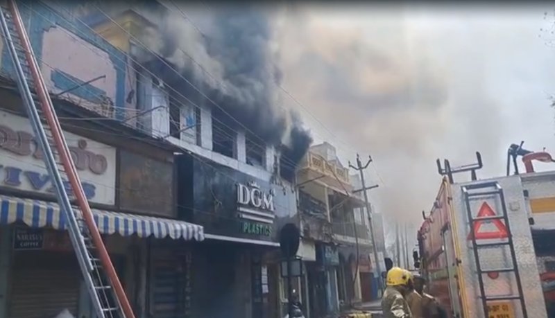 मीनाक्षी मंदिर के पास प्लास्टिक की दुकान में आग लगी