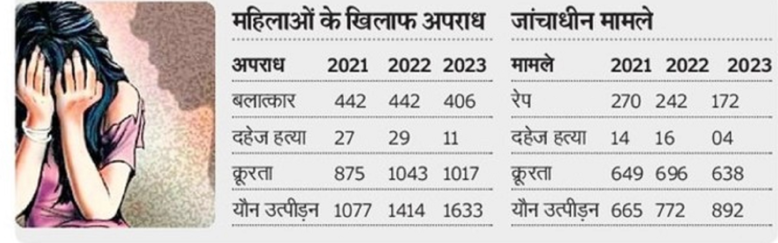 दुखद पहलू यह है कि 2021 से 2023 के बीच बलात्कारों की संया कमोबेस वही रही। 2023 में रेप केसों की संया 406 थी जबकि इससे पूर्व के दो सालों में 442 केस रिपोर्ट हुए। महिलाओं के उत्पीड़न मामले इन सालों में लगातार बढ़े हैं जो ज्यादा चिंताजनक हैं।