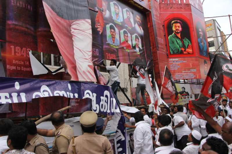 गुरुवार को मदुरै में एआइएडीएमके के कार्यकर्ताओं ने पार्टी विधायक वी.वी. राजन चेल्लपा के नेतृत्व में शहर में मल्टीप्लेक्स थिएटर के सामने प्रदर्शन किया। वे फिल्म के प्रदर्शन को आपत्तिजनक दृश्य हटाने के बाद ही रिलीज करने की मांग कर रहे थे।