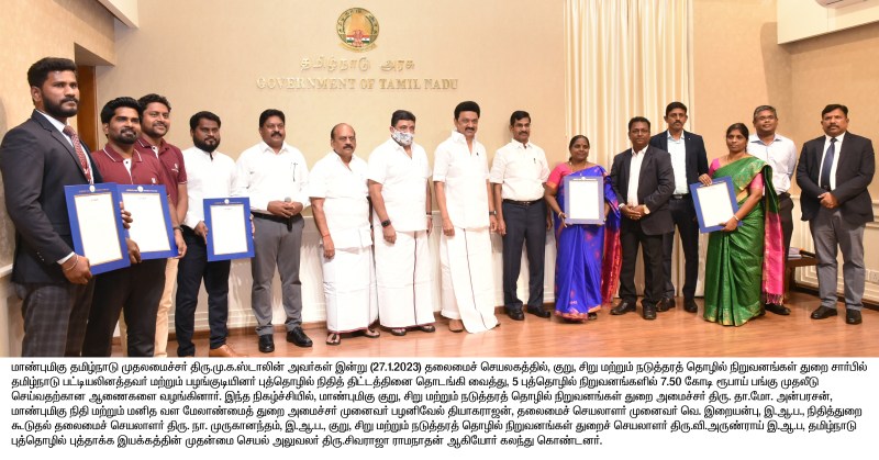 मुख्यमंत्री एम के स्टालिन ने शुक्रवार को सचिवालय में पांच स्टार्टअप्स को स्वीकृति आदेश सौंपे। निवेश अनिवार्य रूप से कंवर्टिबल डिबेंचर (सीसीडी) के रूप में हैं। सरकार के एक बयान में कहा गया है इस पहल का उद्देश्य प्रेरणादायक कहानियों पर मंथन करना है, जो समावेशी सामूहिक उद्यमिता की दिशा में अनुसूचित जाति-अनुसूचित जनजाति के उद्यमियों द्वारा अधिक स्टार्टअप के निर्माण को प्रेरित करेगी।