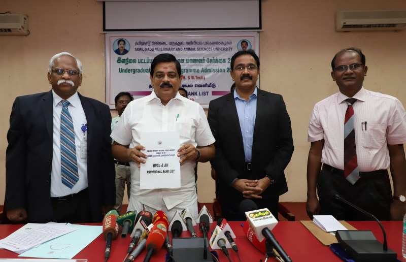 तमिलनाडु पशुचिकित्सा एवं पशु विज्ञान विश्वविद्यालय (तनुवास) ने बुधवार को रैंक लिस्ट जारी किया। इस रैंक लिस्ट के अनुसार अंडरग्रेजुएट पाठ्यक्रमों (बीवीएससी एंड एएच तथा बीटेक) में नामांकन होंगे। धर्मपुरी की रहने वाली एस.स्वाति ने रैंक लिस्ट में पहला स्थान पाया है उन्हें 200 अंक में 199.5 अंक प्राप्त हुए हैं। इसी प्रकार तूतीकोरिन के ए.जैने सिल्विया (199.25) तथा कन्याकुमारी की एम.हर्षा को (199) क्रमश: दूसरा एवं तीसरा स्थान प्राप्त हुआ है। पशु चिकित्सा पाठ्यक्रमों में नामांकन कक्षा बारहवीं के अंक के आधार पर होगा। तनुवास को पिछले साल 12,000 आवेदन प्राप्त हुए थे जबकि इस साल इसमें वृद्धि देखी गई। इस साल यह संख्या 15,476 थी। पशुपालन मंत्री उदुमलै के.राधाकृष्णन ने रैंक लिस्ट जारी करने के बाद संवाददाताओं को बताया कि पिछले साल की तुलना में बीवीएससी तथा एएच के आवेदनों में 29 प्रतिशत की बढ़ोत्तरी हुई है। बीटेक पाठ्यक्रमों के लिए आवेदन की संख्या में 14.64 प्रतिशत की वृद्धि हुई है। मंत्री ने कहा कि हम नए पशुचिकित्सा महाविद्यालयों को शुरू करने की योजना बना रहे हैं। चार पशु चिकित्सा महाविद्यालयों में बीवीएससी तथा एएच पाठ्यक्रम के लिए 360 सीट उपलब्ध हैं। जबकि बीटेक पाठ्यक्रमों (फुड टेक्नालाजी, पोल्ट्री तथा डेयरी) के लिए 100 सीट उपलब्ध है। पिछले साल ओसी के लिए बीवीएससी तथा एएच का कट आफ 196 था।