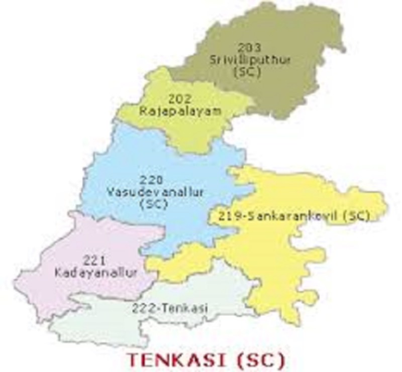 राजापालयम एवं श्रीविल्लीपुत्तुर विधानसभा क्षेत्र विरुदनगर जिले में आते हैं। जबकि तेनकासी, कडयनलूर, वासुदेवानलूर एवं शंकरनकोविल विधानसभा इलाके तेनकासी जिले में हैं। तेनकासी लोकसभा क्षेत्र के अधीन आने वाले छह विधानसभा क्षेत्रों में से तीन विधानसभा क्षेत्र अनुसूचित जाति वर्ग के लिए आरक्षित है। तीनों ही आरक्षित सीटों से एआईएडीएमके के विधायक है। पिछले चुनाव में कडयनलूर से इंडियन यूनियन मुस्लिम लीग का उम्मीदवार जीता था।