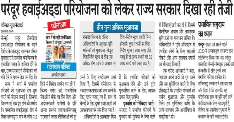 चेन्नई. परंदूर ग्रीनफील्ड हवाईअड्डा परियोजना के बढ़ते विरोध के बावजूद, खासकर तमिल सुपरस्टार से राजनेता बने विजय के प्रस्तावित स्थल के हालिया दौरे के बाद, राज्य सरकार ने परियोजना को गति देने के प्रयास तेज कर दिए हैं।
