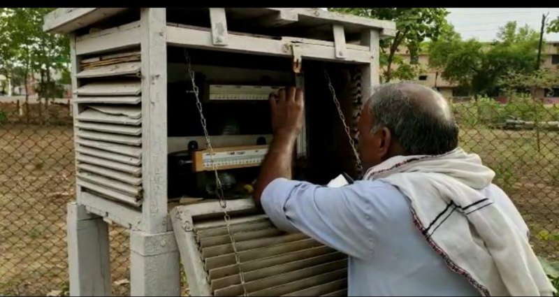 नौगांव में लगी मौसम विभाग की मशीन से तापमान मापते हुए