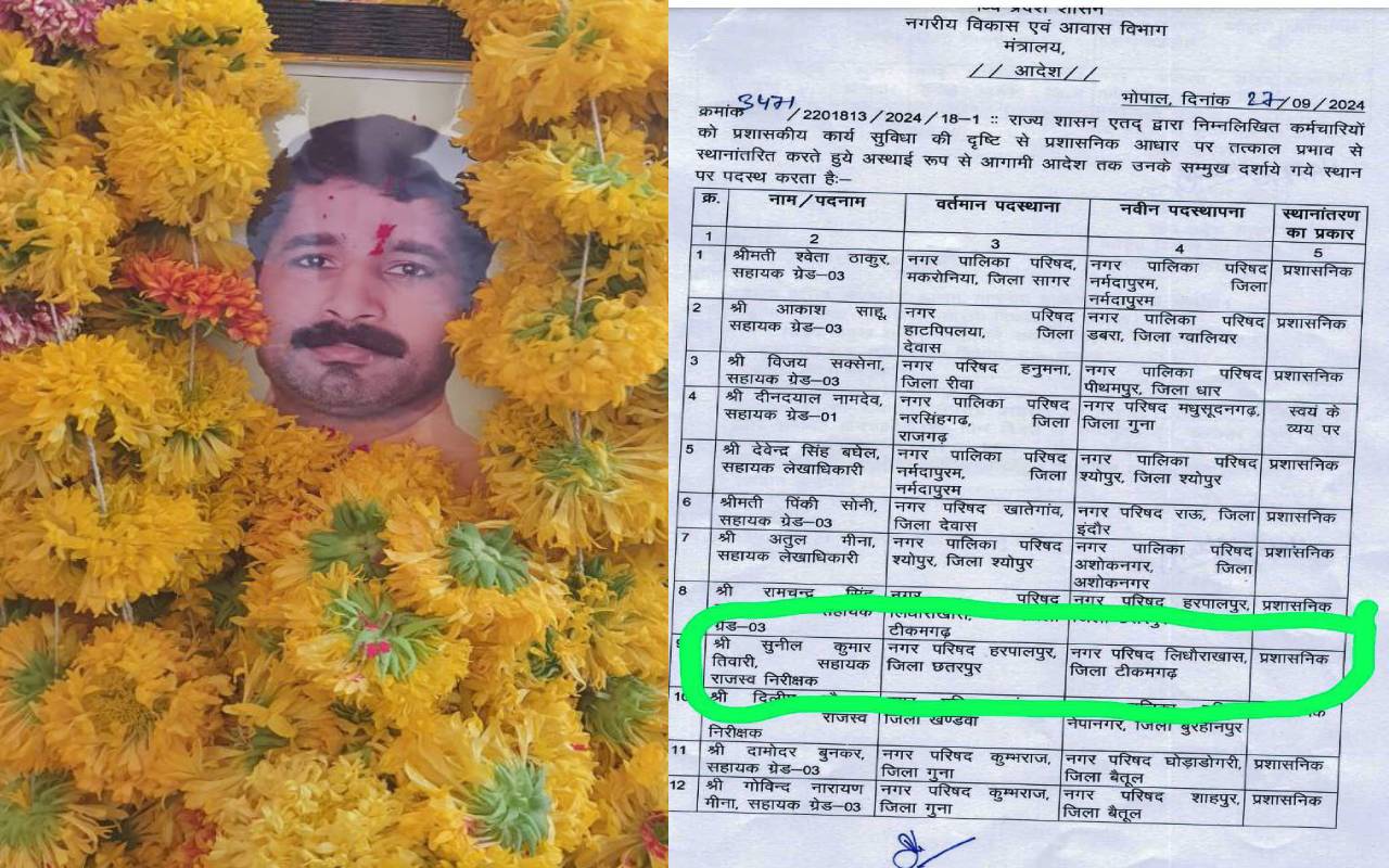 छतरपुर की हरपालपुर नगर परिषद में सहायक राजस्व निरीक्षक पद पर पदस्थ रहे सुनील कुमार तिवारी का 7 मई 2024 को निधन हो गया था, लेकिन शुक्रवार को नगरीय प्रशासन विभाग द्वारा जारी की गई एक स्थानांतरण सूची में दिवंगत सुनील कुमार तिवारी को हरपालपुर से टीकमगढ़ स्थानांतरित किए जाने का आदेश दिया गया। जैसे ही यह सूची सामने आई वैसे ही लोगों ने विभाग को लापरवाह बताते हुए तरह-तरह की बातें करना शुरु कर दिया।