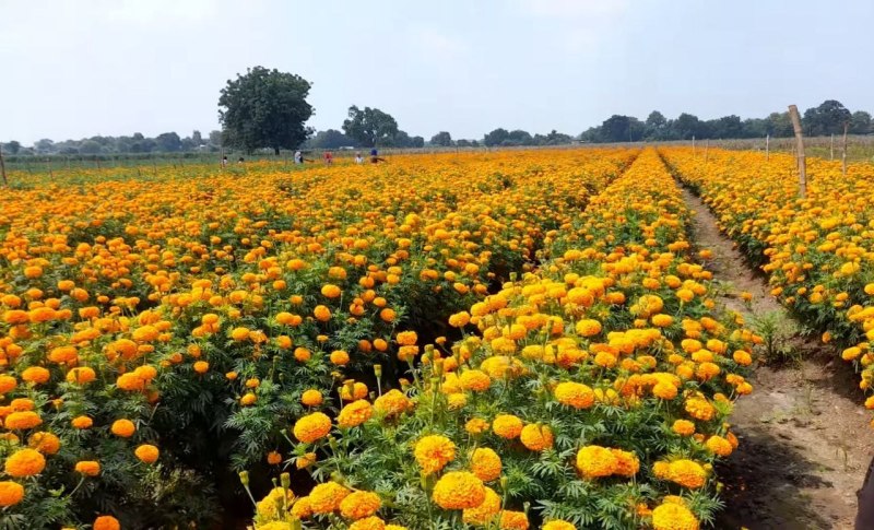 जिला मुख्यालय से लगे गांवों में होने लगी गेंदे की खेती छतरपुर से लगे गांव चंद्रपुरा निवासी हरदयाल कुशवाहा अपनी जमीन में फसल उत्पादन के साथ-साथ 1 बीघा जमीन में गेंदे के फूल की खेती करता है। विक्रेता खेत से ही फूल ले जाते है। साथ ही फूलों की डिमांड इतनी ज्यादा रहती हैं कि वह विक्रेताओं को फूल उपलब्ध नहीं करा पाते। वह अपनी खेती पर पिछले 2 साल से गेंदा के फूल की खेती कर रहे है। इससे उसे अन्य फसलों की अपेक्षा अच्छा खासा मुनाफा भी हो रहा है। विपिन ने बताया छतरपुर बाजार से ही गेंदे के फूल के बीज उपलब्ध हो जाते हैं। जिससे उन्हें 20-25 दिन में नर्सरी तैयार करने में लगते हैं। फिर मल्चिंग पद्धति से पौधरोपण करते है और लगातार उनकी देखरेख की जाती है। तब जाकर दो से ढाई महीने में पौधों में फूल आने लगते हैं।