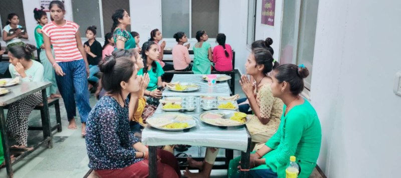 छात्रावास में सामूहिक भोजन करते बच्चे