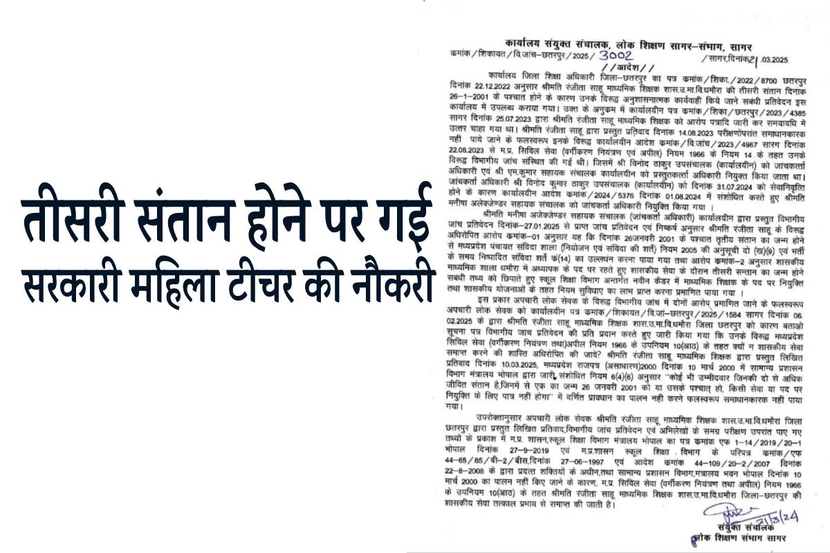 छतरपुर जिले के धमौरा स्थित शासकीय उच्चतर माध्यमिक विद्यालय में पदस्थ महिला शिक्षक रंजीता साहू की सेवाएं संयुक्त संचालक भोपाल ने समाप्त कर दी हैं। यह कार्रवाई 2022 में हुई एक शिकायत के आधार पर की गई, जिसमें यह आरोप था कि रंजीता साहू ने तीन संतान होने के बावजूद सरकारी नौकरी का लाभ लिया। शिकायत में ये भी कहा गया था कि तीसरी संतान होने के बावजूद रंजीता साहू ने इस बात को छिपाया और नौकरी का लाभ लेती रहीं।