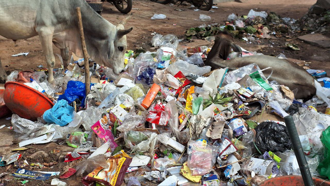 खुले में डंप कचरा को खाते मवेशी