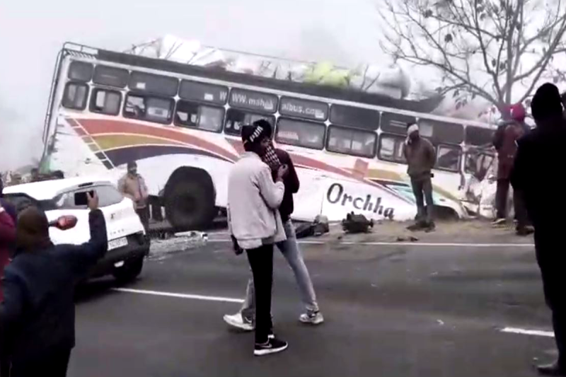 कोहरे के कारण बकस्वाहा में यात्री बस दुर्घटनाग्रस्त (Photo Soure- Patrika Input)