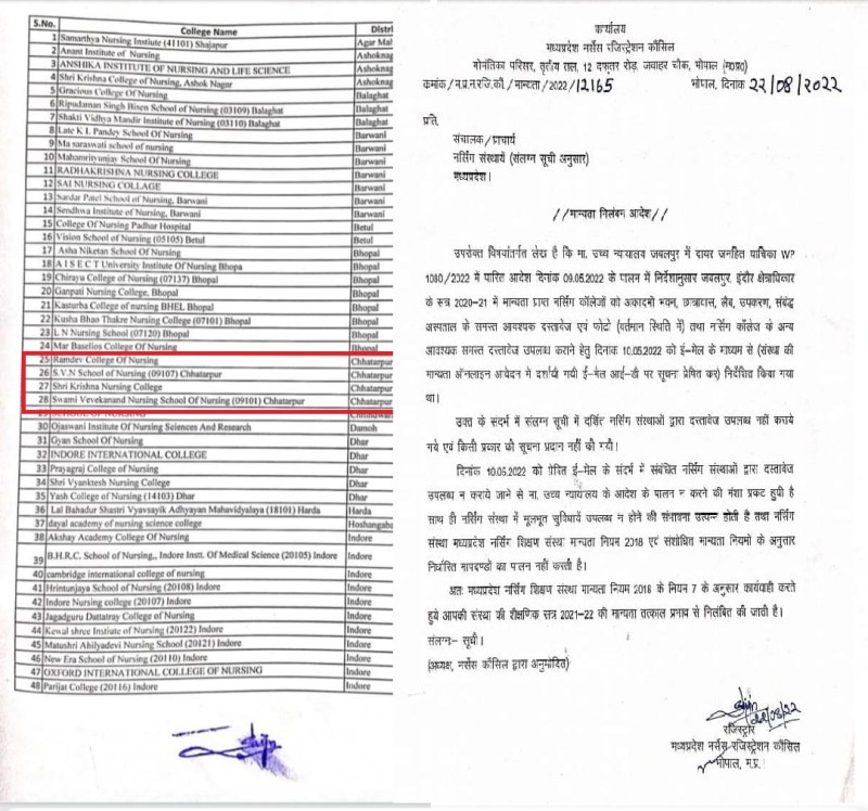 गौरतलब है कि एड. विशाल बघेल की जनहित याचिका पर हाईकोर्ट ने सुनवाई की। जिसमें मध्य प्रदेश नर्सिंग काउंसिल की ओर से उपमहाधिवक्ता स्वप्निल गांगुली ने काउंसिल रजिस्टार सुनीता सिंजू का शपथ पत्र पेश किया। उन्होंने कोर्ट को बताया कि गत वर्ष 2020-21 में खुले हुए 453 कालेजों में से 94 को इस वर्ष मान्यता नवीनीकरण की अनुमति नहीं दी गई है। अनियमितता के चलते 93 नर्सिंग कॉलेजों की मान्यता 22 अगस्त को निलंबित कर दी गई है।