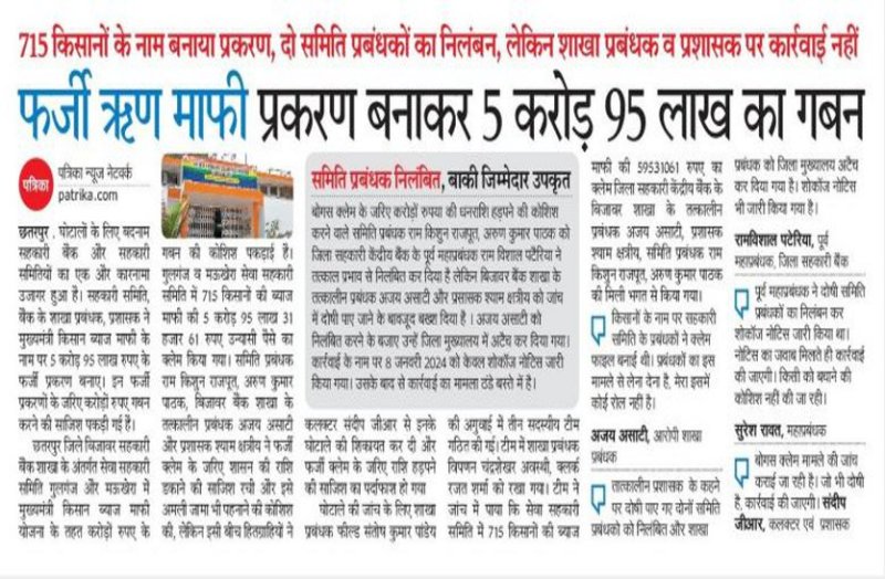 बोगस क्लेम के जरिए करोड़ों रुपया की धनराशि हड़पने की कोशिश करने वाले समिति प्रबंधक राम किशुन राजपूत, अरुण कुमार पाठक को जिला सहकारी केंद्रीय बैंक के पूर्व महाप्रबंधक राम विशाल पटैरिया ने तत्काल प्रभाव से निलंबित कर दिया है लेकिन बिजावर बैंक शाखा के तत्कालीन प्रबंधक अजय असाटी और प्रसासक श्याम क्षत्रीय को जाँच में दोषी पाए जाने के बावजूद बख्श दिया गया था। अजय असाटी को निलंबित करने के बजाए उन्हें जिला मुख्यालय में अटैच कर दिया गया। लेकिन अपर कलेक्टर द्वारा बनाई गई तीन सदस्यीय जांच टीम की रिपोर्ट पर अब अजय असाटी को भी निलंबित कर दिया गया है।