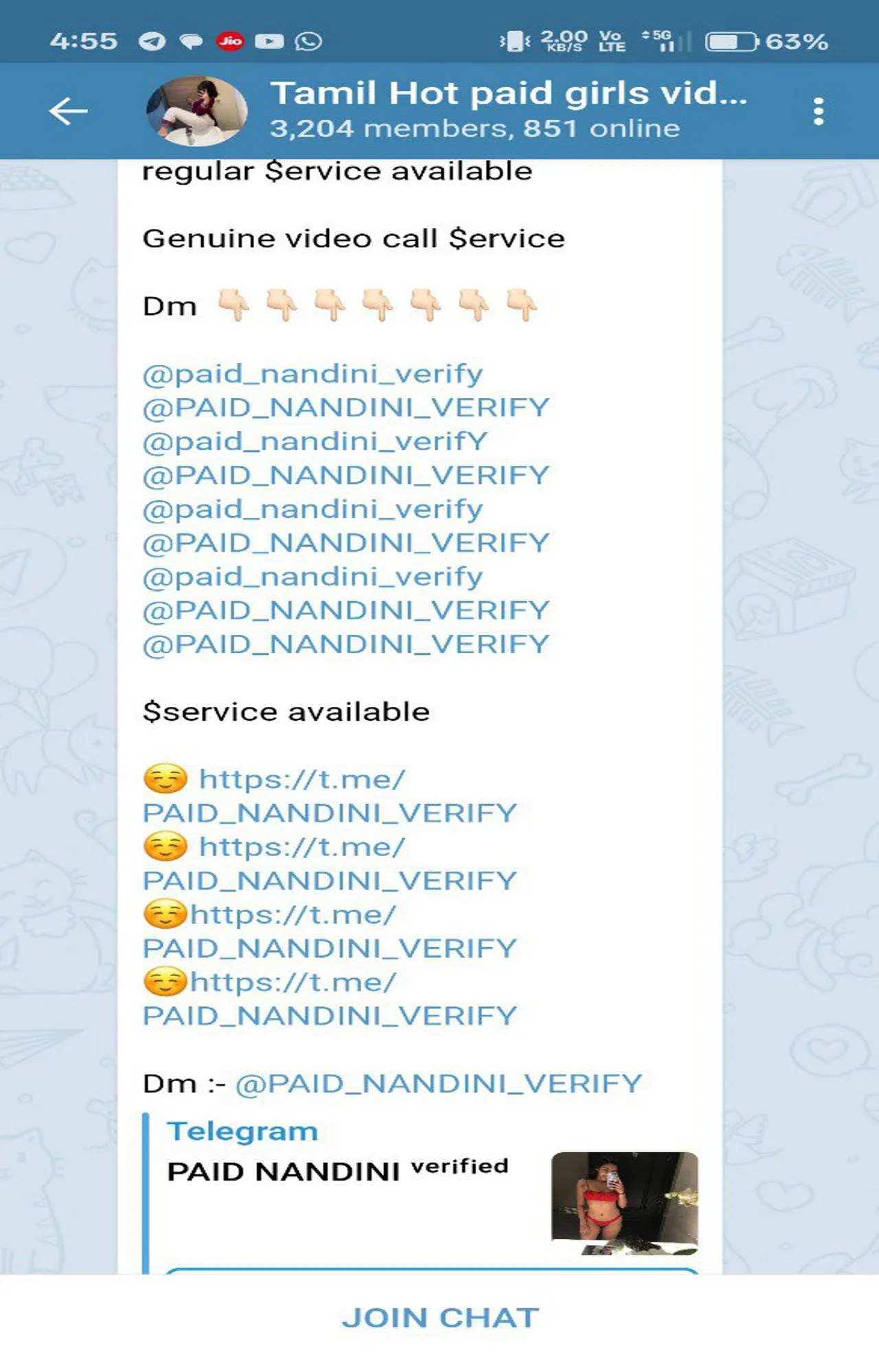 टेलीग्राम में इन दिनों लिंक आने का सिलसिला बढ़ता जा रहा है। लोकेशन के हिसाब से इस पर वहां के लिंक भेजे जा रहे हैं। हाल ही में खजुराहो से इस माह 3 लिंक टेलीग्राम पर भेजी गई जिसमें वो वीडियो शामिल होते हैं जो लोकल स्तर पर रिकॉर्ड किए गए होते हैं। इसमें लोकेशन और आयु सीमा के अनुसार पैसे लिंक पर भेजे जाते हैं।